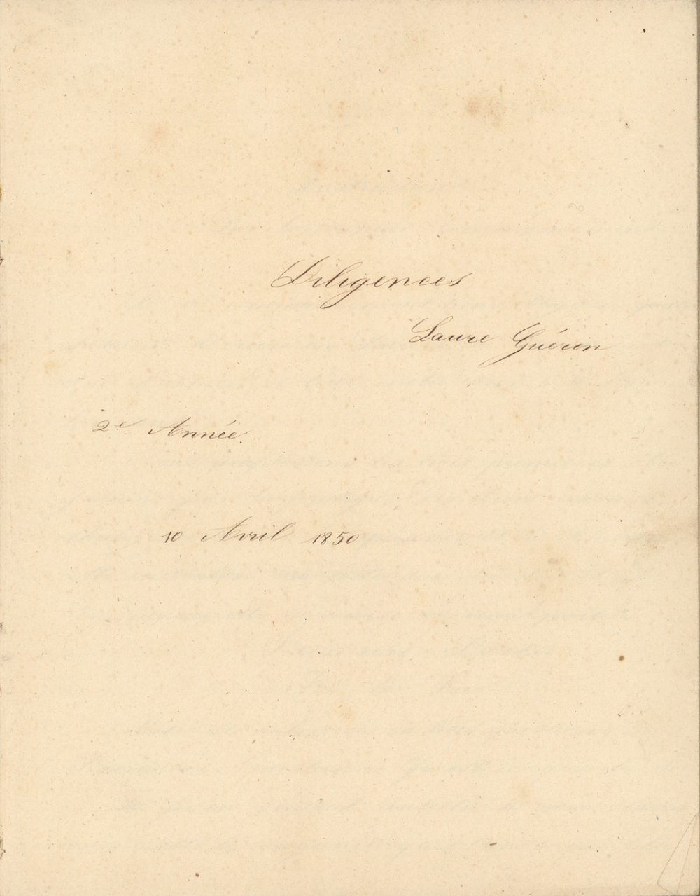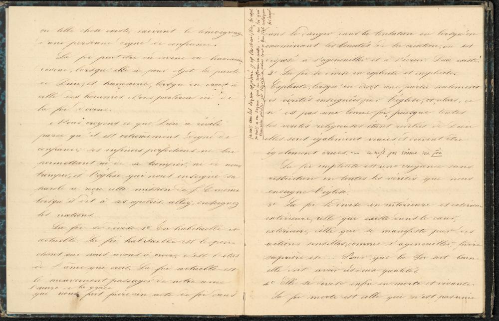 Notes : Il s'agit d'un cahier d'instruction morale et religieuse catholique rédigé par Laure Guérin en 1850. Il n'est pas précisé à quelle institution ou établissement scolaire appartient l'élève, alors âgée de 12-13 ans. Néanmoins, il est probable que la scolarité ait été effectuée dans la ville de Meaux et que cet ouvrage soit l'objet d'un cours de catéchisme de deuxième année préparant à la première communion.