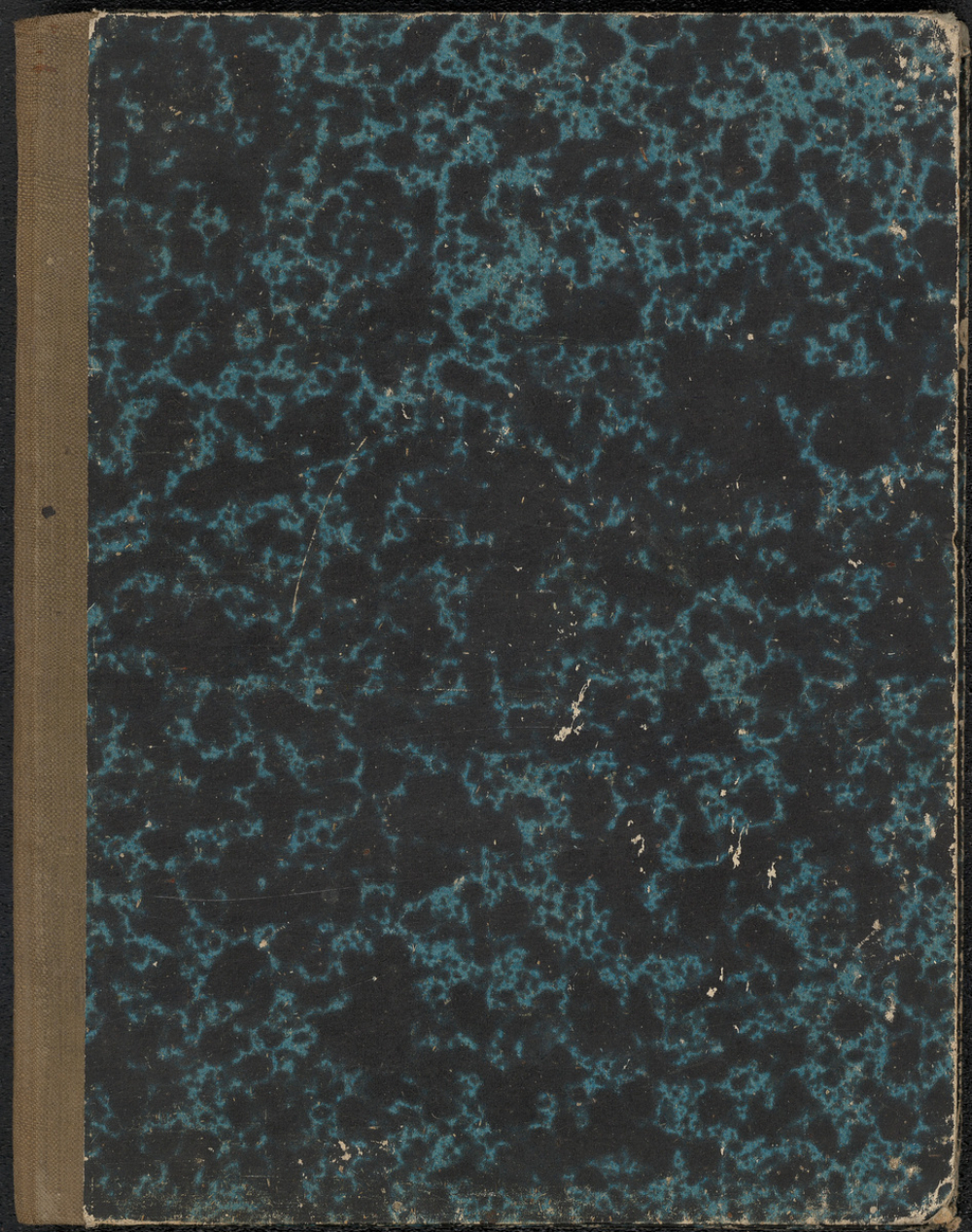 Description : Couverture cartonnée à motif marbré noir et vert. Dos toilé vert kaki. Reliure cousue. Tranches mouchetées en bleu. Gardes blanches. Réglure à simple lignage.