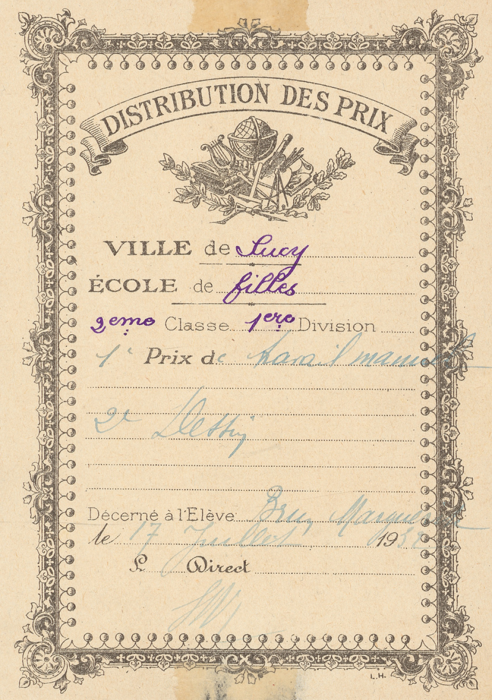 Notes : Ecole de filles de la ville de Sucy, "1er Prix de travail manuel, 2e dessin, décerné à l'Elève B... M.... le 17 juillet 1932", 2ème classe 1ère division, signé par le/la direct....