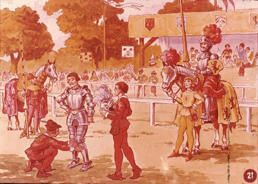Représentations : tournoi, chasse, livre manuscrit, poivre, boussole / Légendes des diapositives :
