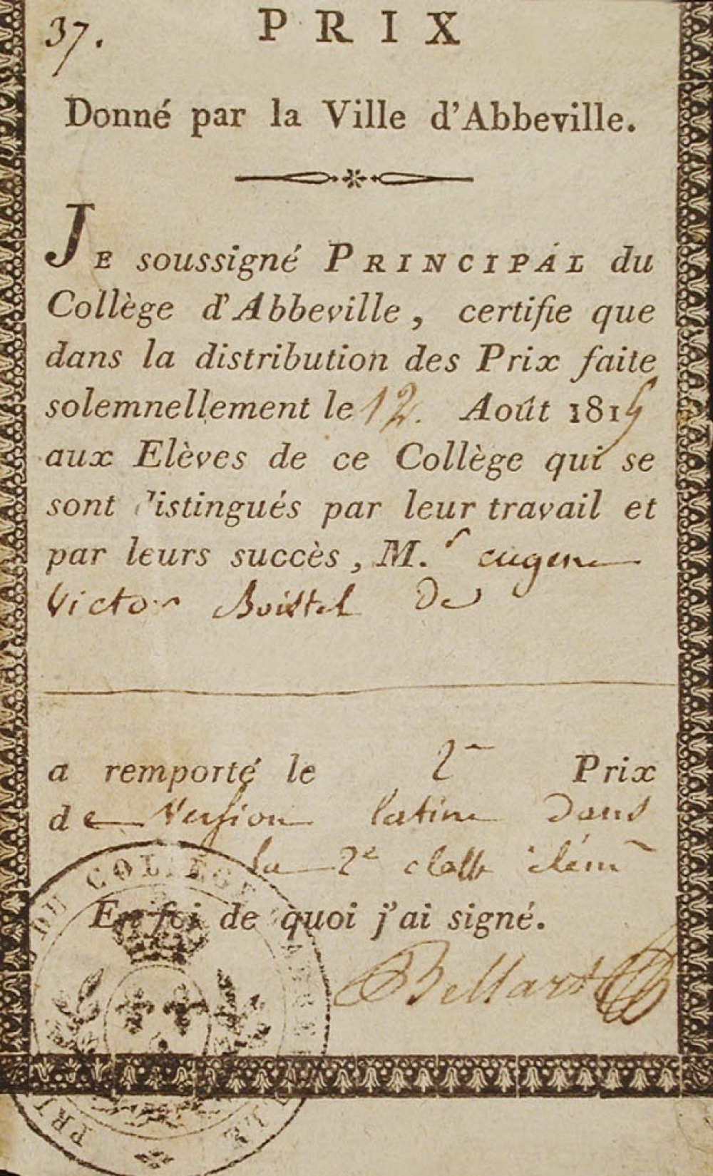Notes : " Prix / donné par la ville d'Abbeville. / Je soussigné Principal du / collège d'Abbeville, certifie que / dans la distribution des Prix faite / solennellement le 12 Août 1819 / aux Elèves de ce Collège qui se / sont distingués par leur travail et / par leurs succès, M. Eugène Victor Boissel (?) De / a remporté le 2ème Prix / en version latine dans / la 2ème classe élémentaire / En foi de quoi j'ai signé ". (signé)