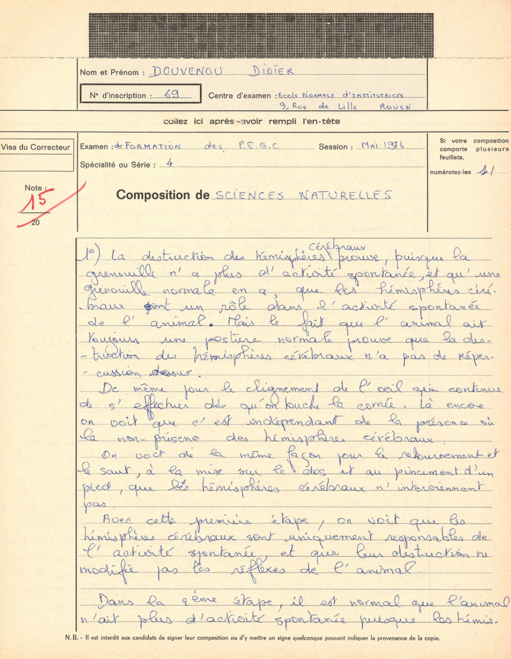 Notes : Il s'agit de la copie d'examen au concours d'entrée dans les centres PEGC (Professeur d'Enseignement Général de Collège), du candidat Didier Douvenou.