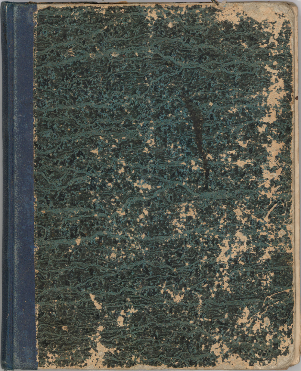 Description : Couverture cartonnée recouverte de papier ciré vert à motif marbré. Dos toilé en simili galuchat bleu. Reliure cousue. Réglure à simple lignage d'interlignes 8 mm sans marge apparente.