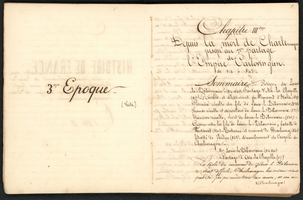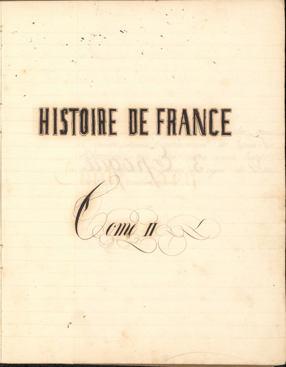 Notes : Il s'agit du cahier d'Histoire de l'élève Emile Bry, scolarisé en "Classe de Rhétorique, probablement au collège Saint-Vincent-de-Paul ou à Saint-Stanislas à Poitiers, à partir durant les années 1857 à 1859.