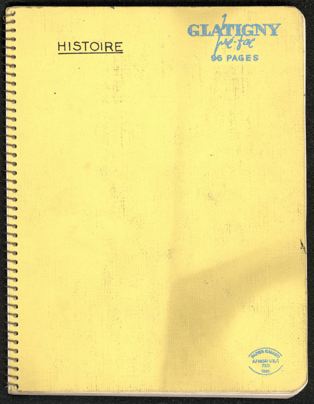 Description : Couverture synthétique en simili tissu jaune. Reliure métallique en spirale. Réglure Séyès carreaux 8 x 8 mm avec marge rose.