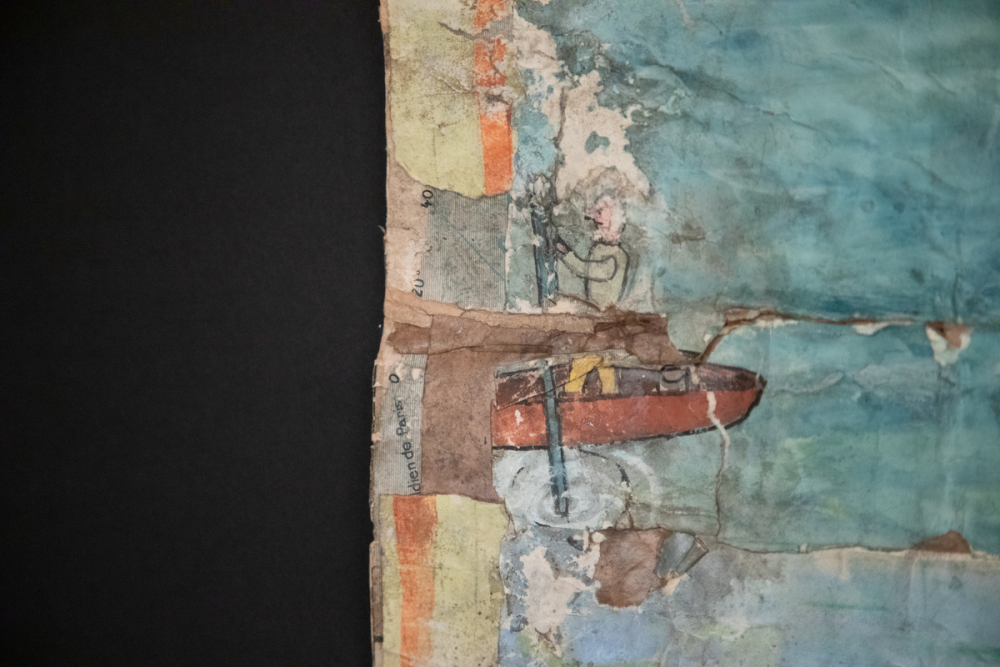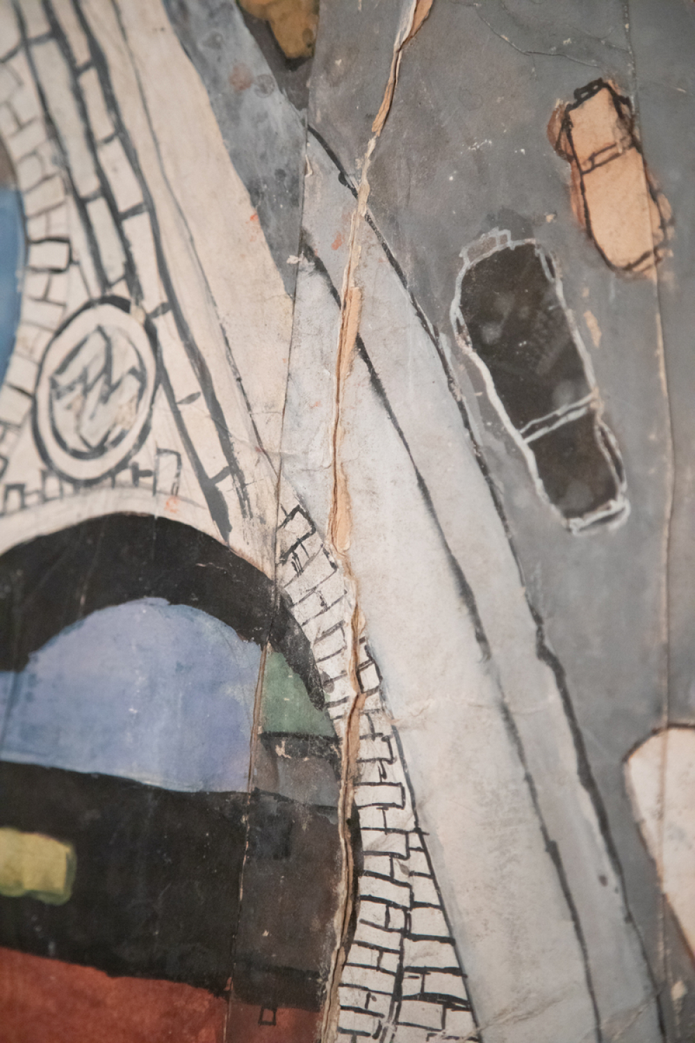 Description : Fresque à la gouache composée de feuilles de papier à dessin juxtaposées collées sur du papier kraft.