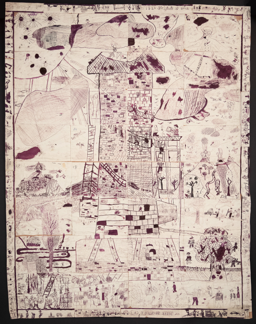 Description : Fresque à l'encre noire composée de feuilles de papier à dessin juxtaposées collées sur du papier kraft.