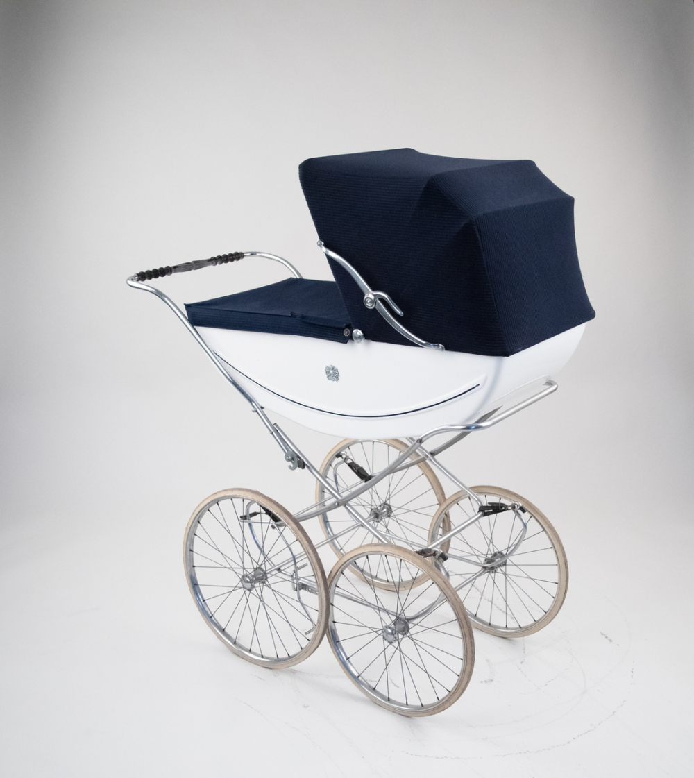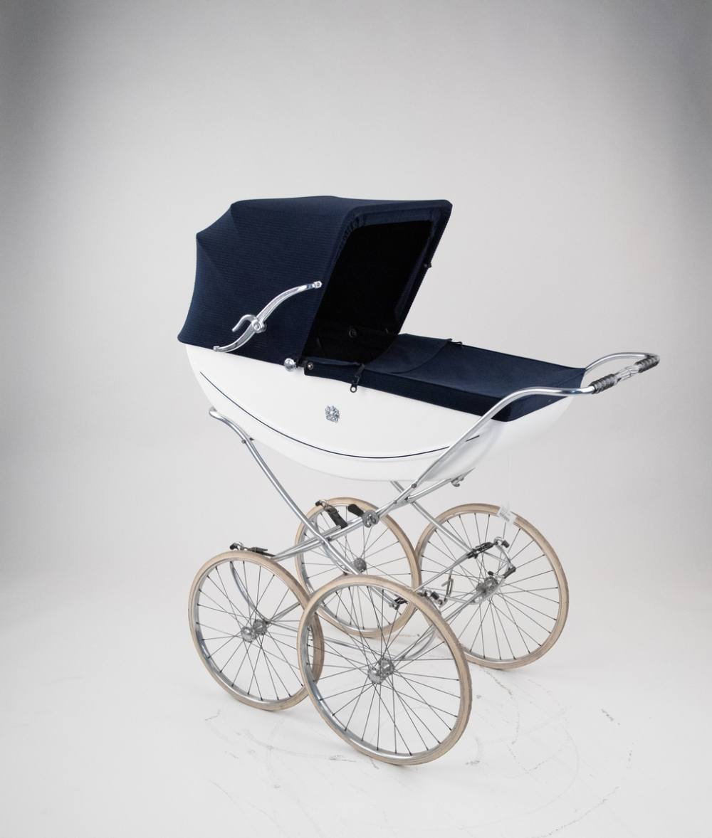 Description : Une nacelle en plastique blanche avec un écusson sur les côtés représentation d'un lion et d'une licorne symbole du Royaume Unis. Intérieur en toile plastifiée de couleur bleu marine. Capote avec compas et son tablier en velours bleu marine, châssis pliable avec frein à pieds, guidon chromé et poignée en plastique moulée, suspension caoutchouc noir, quatre grandes roues décalées à rayons métalliques deux dimensions . Un matelas et son oreiller