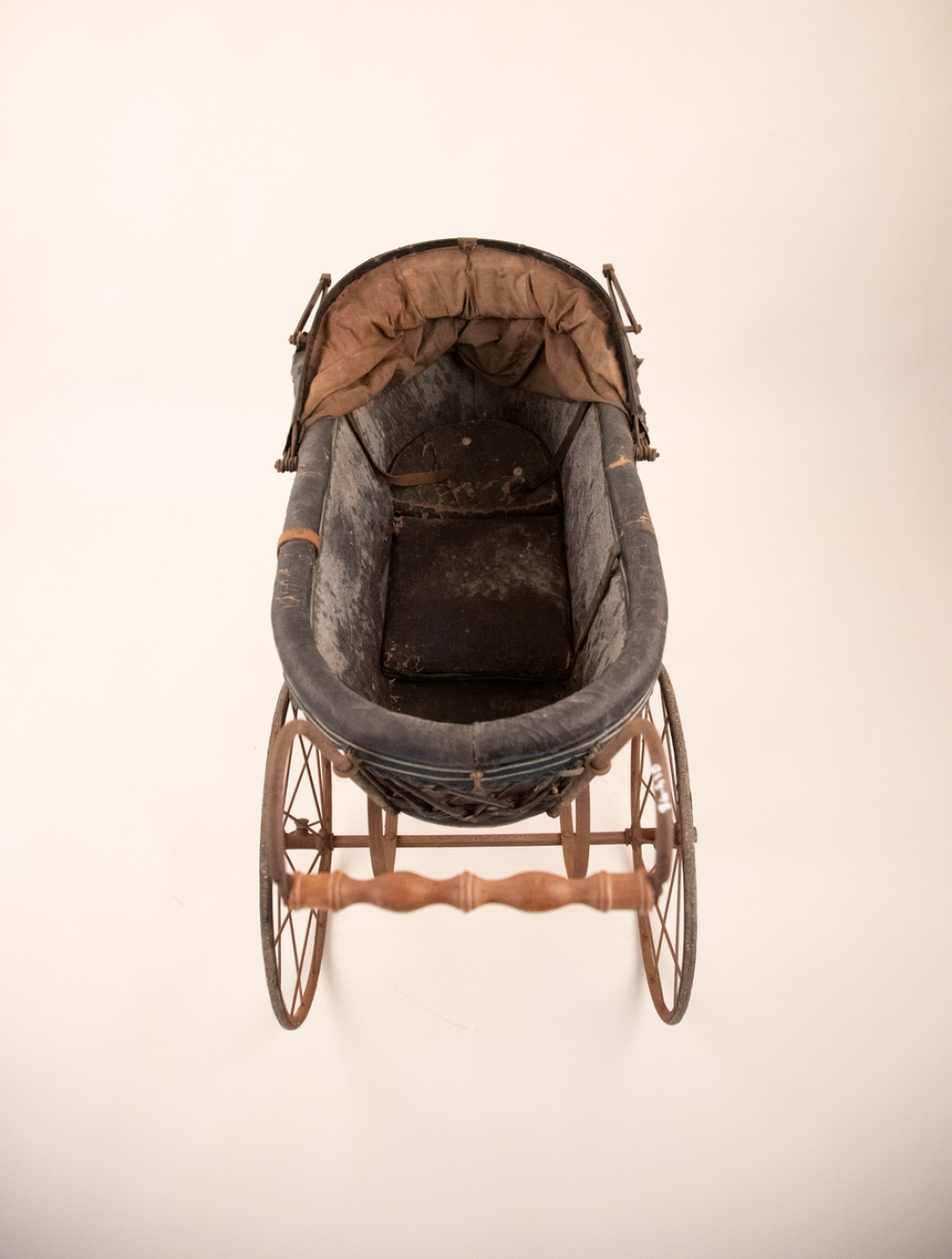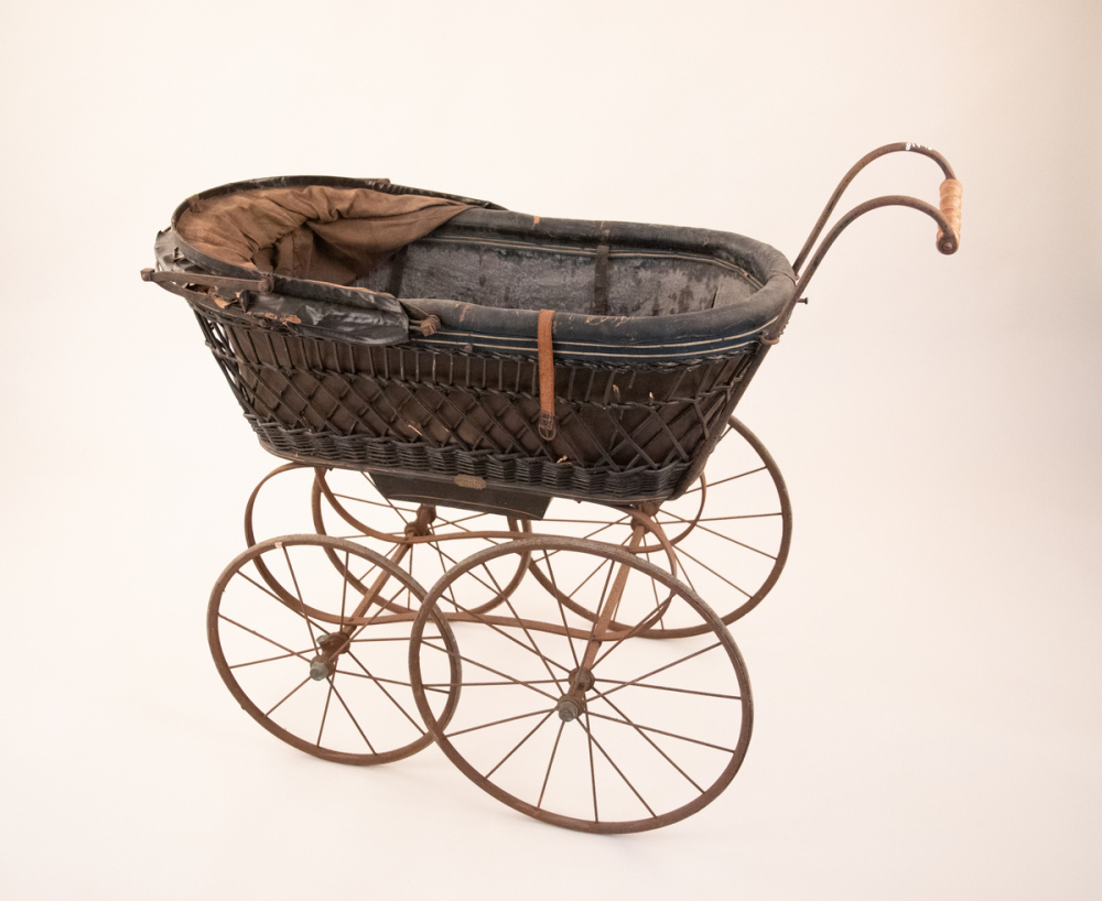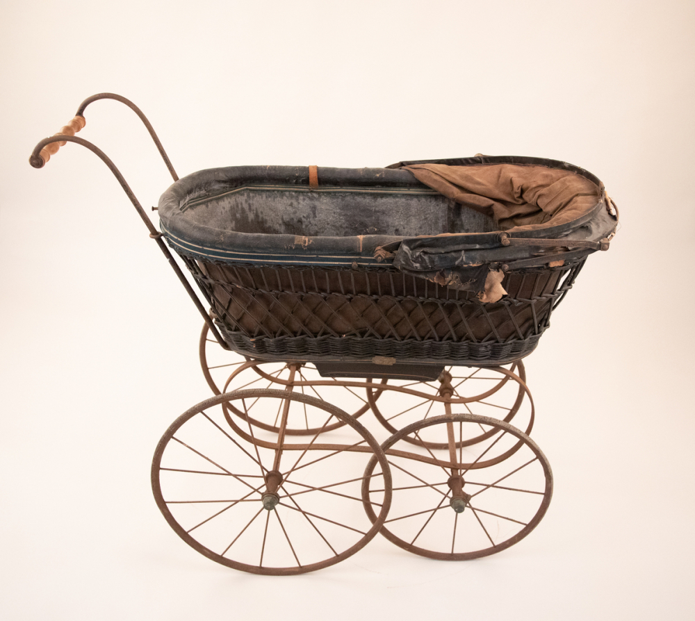 Description : Caisse en osier teinté et tressé avec filet doré et une plaque de fabricant, châssis en métal simple, l'intérieur est capitonné et doublé d'une toile bleu foncé et enduite, deux sièges avec un creux central, deux des trois coussins sont présents, deux ceintures en cuir, capote doublé deux plis avec grands compas, amovible dans les deux sens, poignées en bois tourné, quatre roues décalés avec pneus caoutchoutés, tablier de toile sombre enduit avec trois œillets de fixations