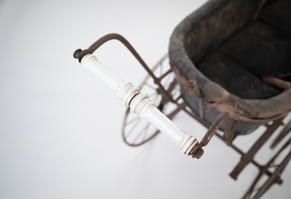 Description : Caisse en bois, motif floral sur les côtés, 4 roues en fer, suspension en fer.