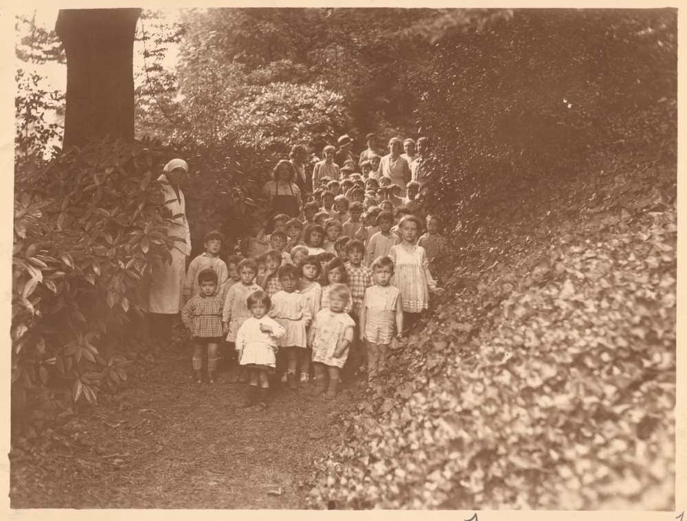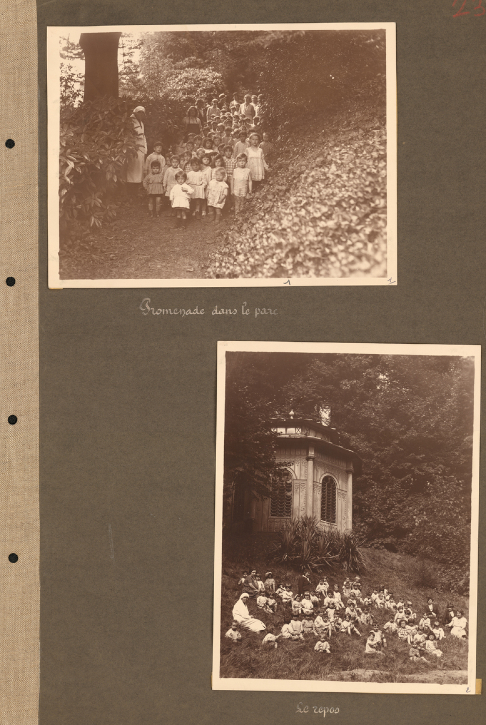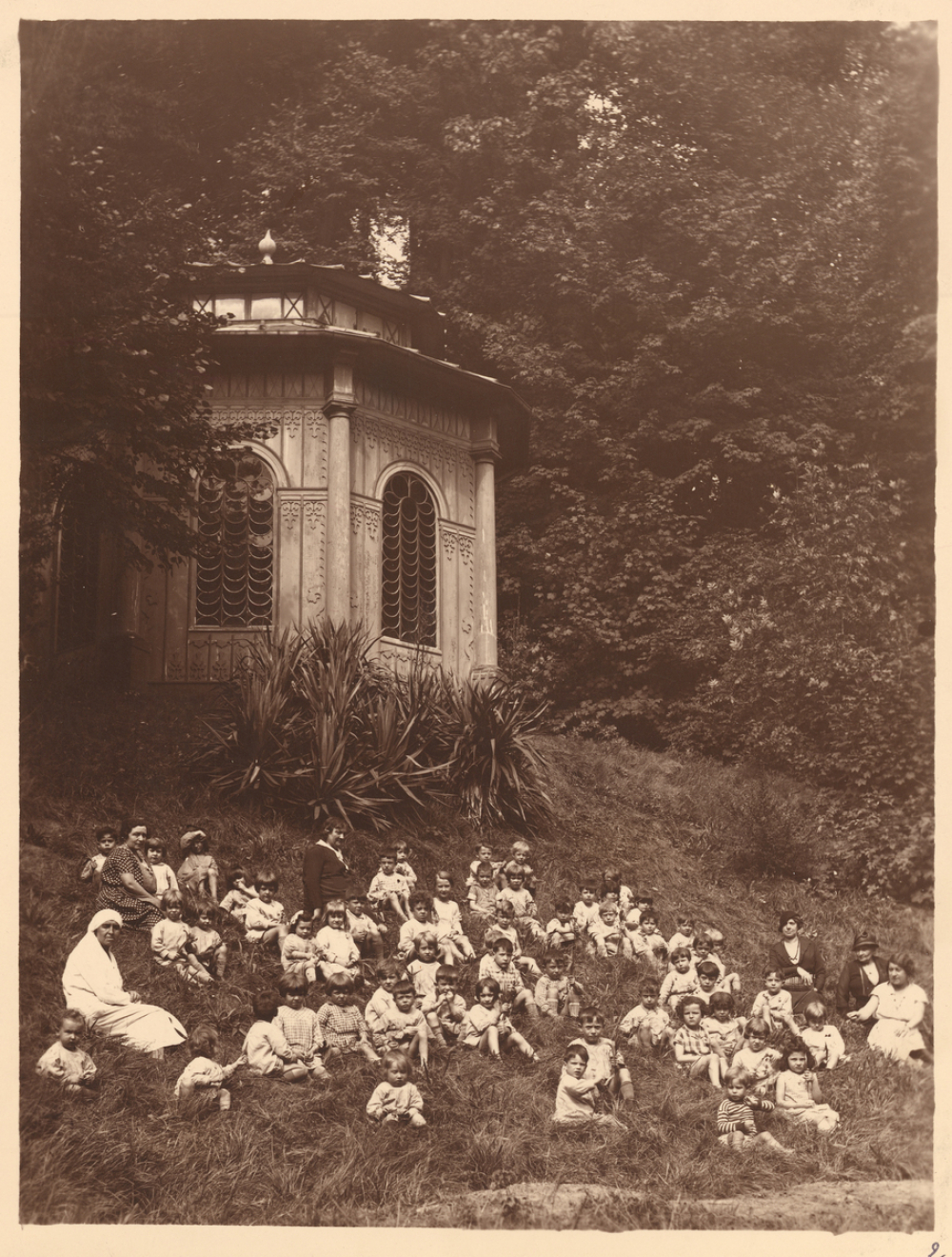 Sur la photographie du dessous, le groupe d'enfants est assis sur une pente herbeuse devant un pavillon ornementé aux fenêtres cintrées. Les adultes se tiennent parmi eux. L'arrière-plan est occupé par une végétation dense et des arbres de grande taille.