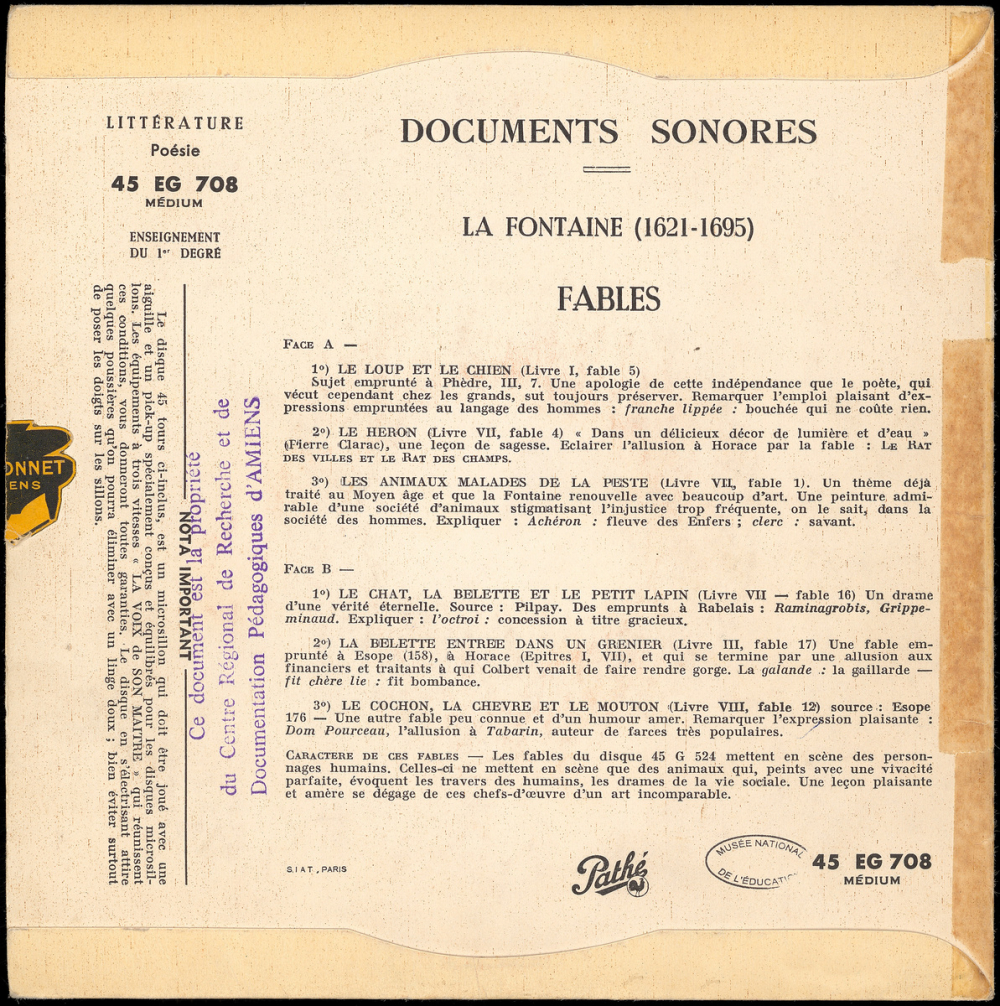 - Face A : Le loup et le chien, Le héron, Les animaux malades de la peste,