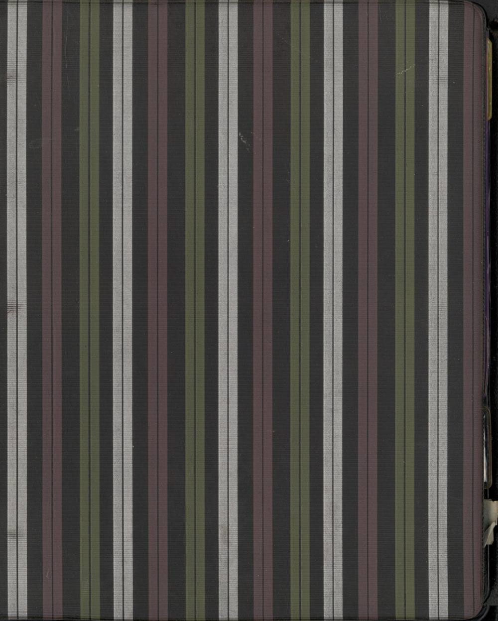 Description : Classeur à anneaux, noir à rayures. Pochettes plastiques perforées avec onglets de couleur en matière plastique. Feuilles aux coins arrondis, au format 21 x 29,7 cm, soit de type Canson soit à réglure Séyès avec marge rose et carreaux 8 x 8 mm, de couleur.