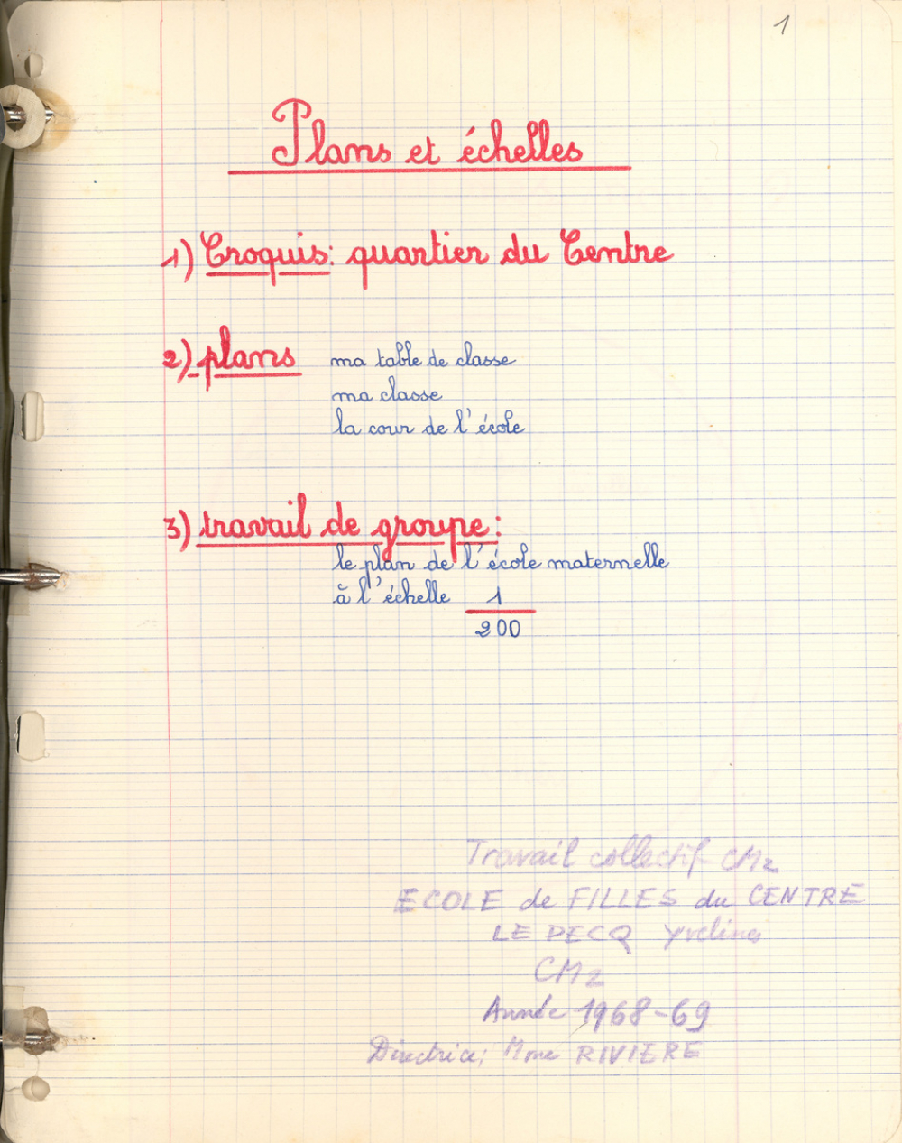 Plans et échelles : Croquis quartier du Centre, plans (table de classe, classe, cour), Plan de l'école maternelle à l'échelle 1/200