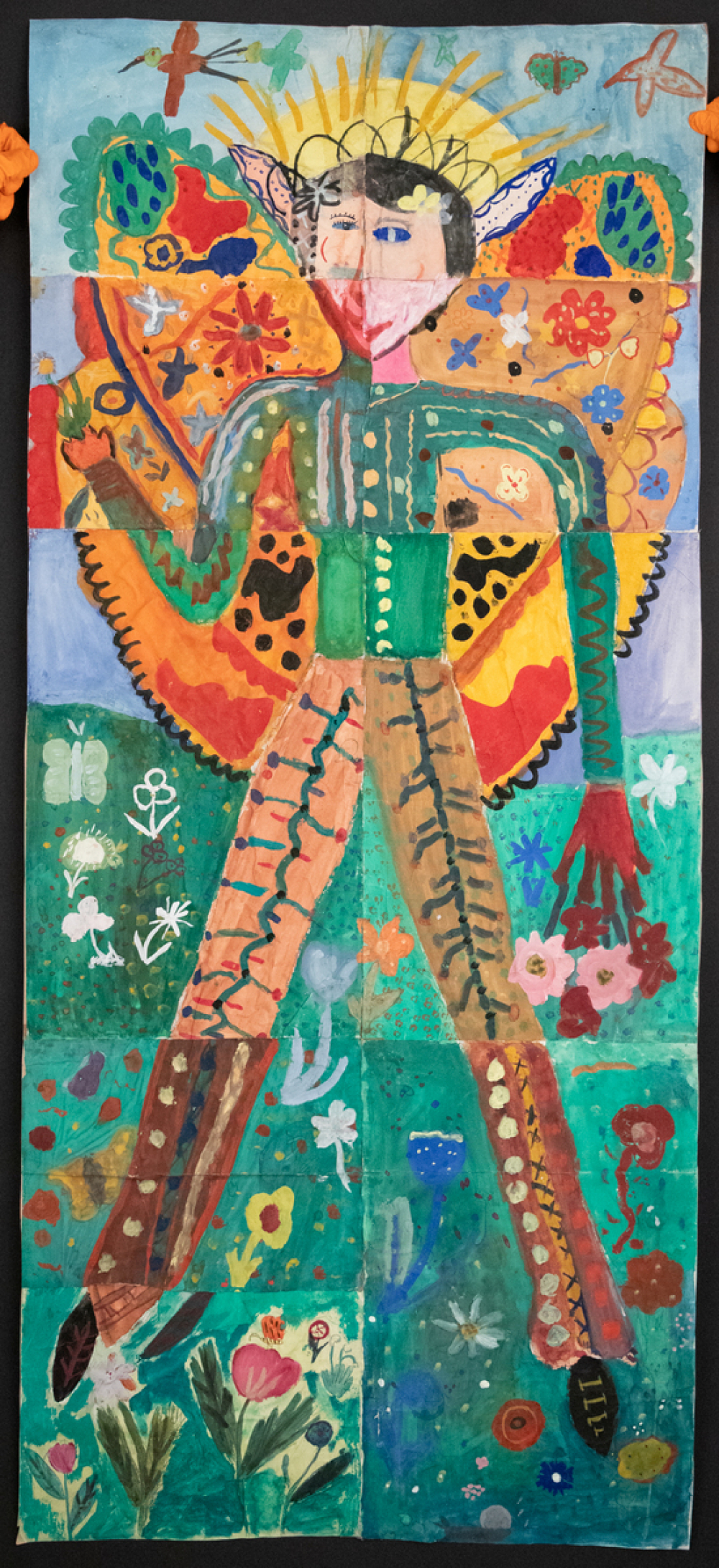 Description : Fresque à la gouache composée de feuilles de papier à dessin juxtaposées collées sur du papier kraft.