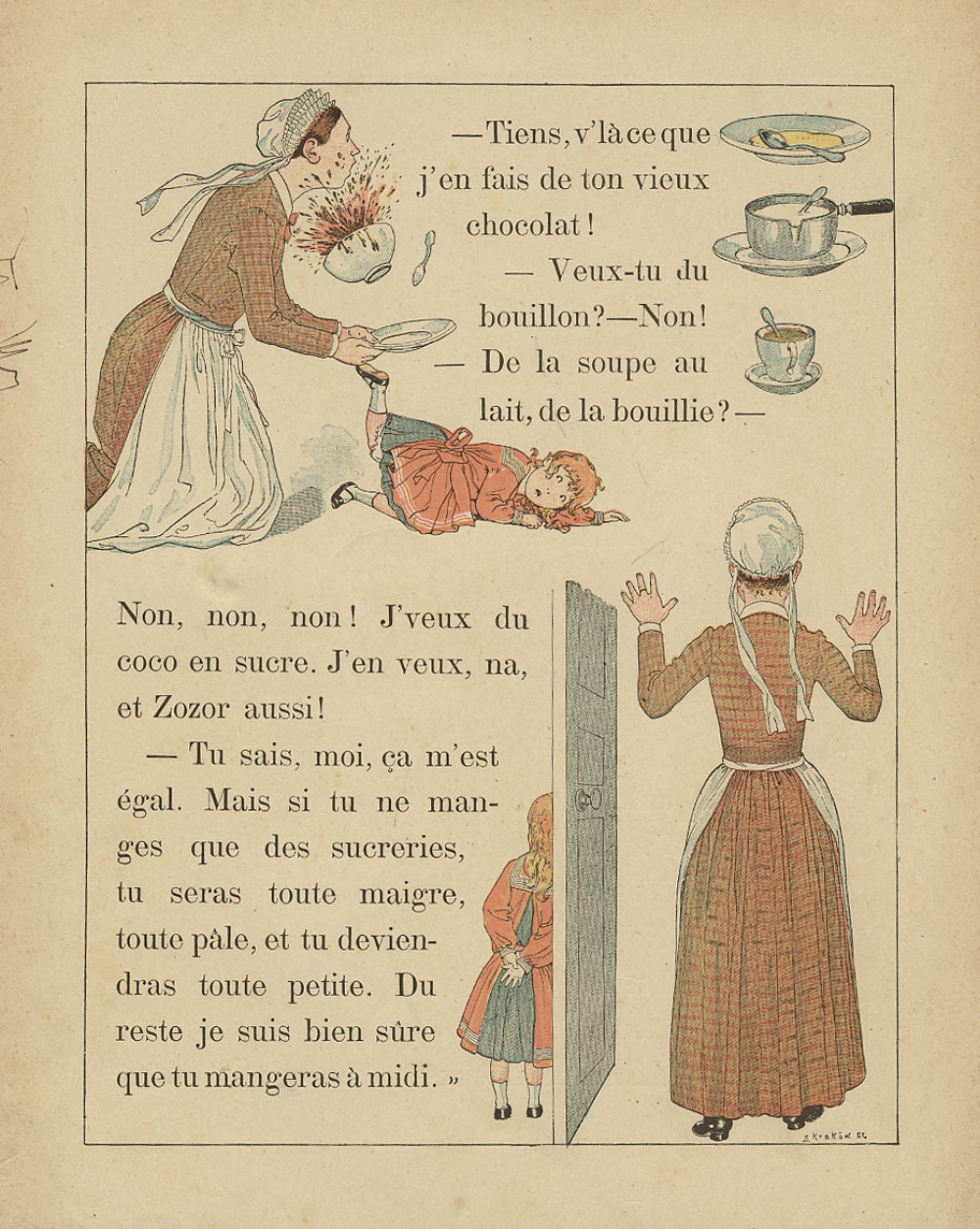 Description : Cartonnage recouvert d'une chromolithographie : sur fond vert, quatre illustrations de Job en vignette.