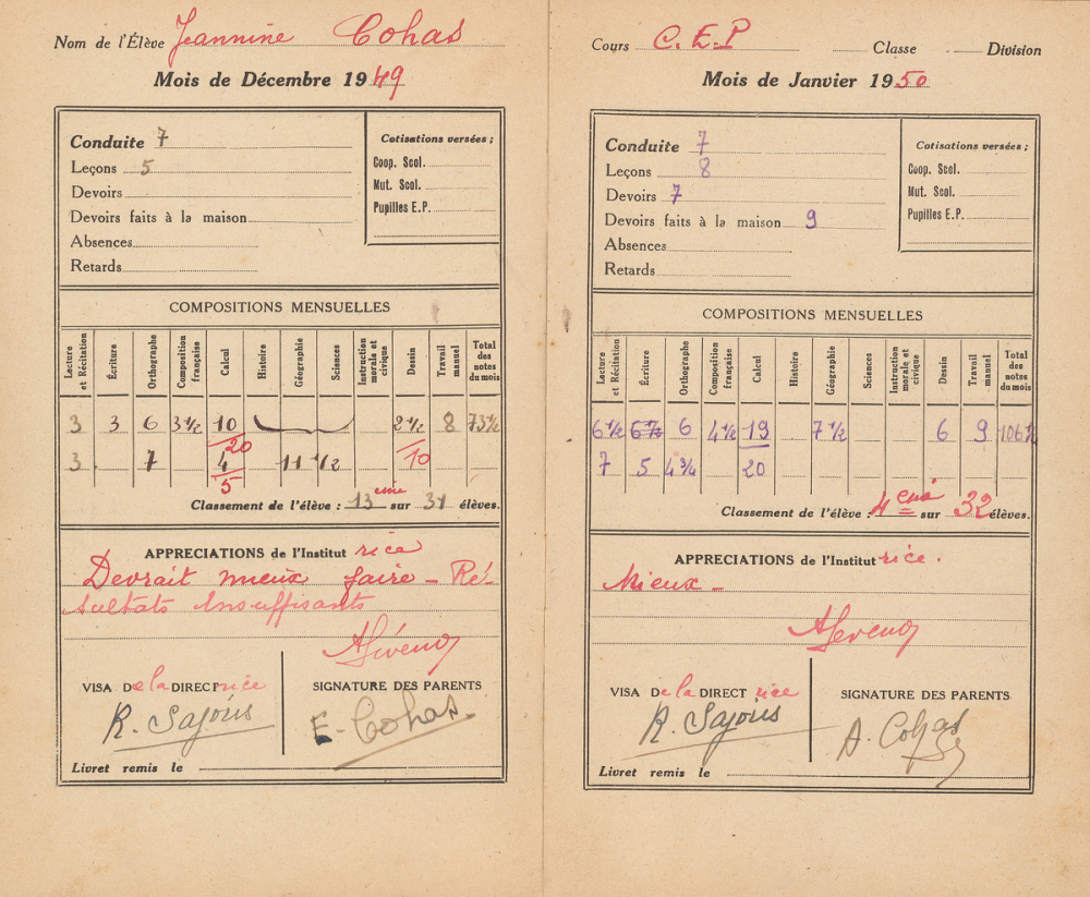 Description : Livret de correspondance (carnet de notes) en papier. Imprimé à l'encre noire avec mentions manuscrites à l'encre rouge ou noire par l'enseignant. Couverture en papier bleu. Réglure piquée agrafée.