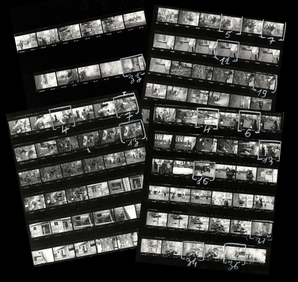 Description : Ensemble comprenant 123 négatifs 35 mm, 3 diapositives et 4 planches-contacts (soit un total de 123 visuels). Après sélection, le reportage photographique diffusé contenait 16 photographies.
