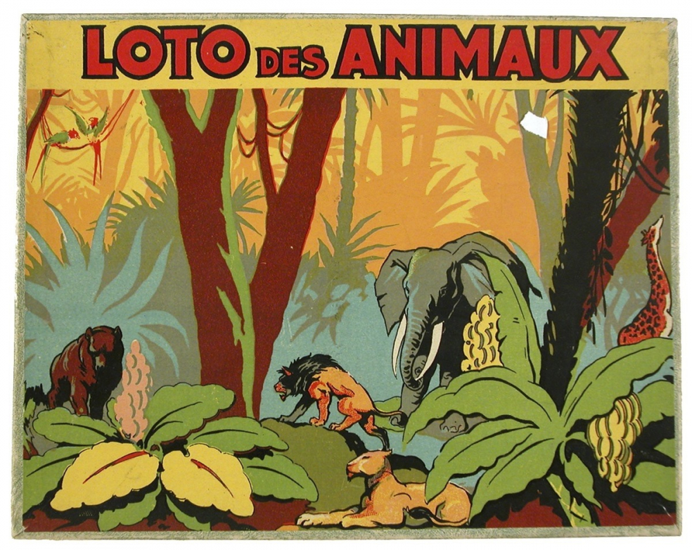 Notes : Couvercle : animaux dans un paysage équatorial, figuration stylisée; cartons représentant chacun 12 animaux numérotés caractéristiques d'un continent; planche à découper pour confectionner des jetons; règle du jeu collée à l'intérieur du couvercle.