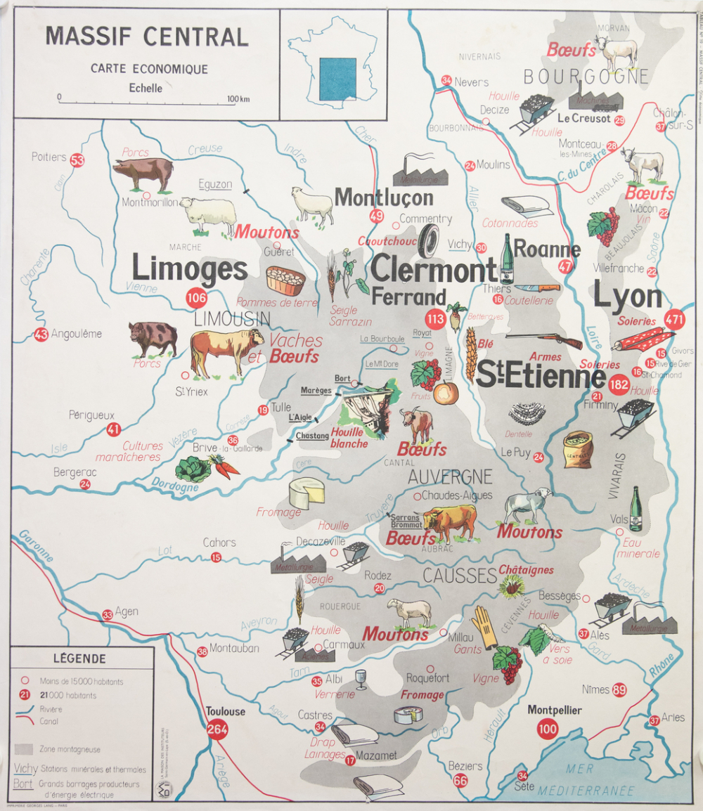 Représentations : Massif Central, Région méditerranéenne, Corse / Au recto, carte du Massif Central où figurent les différentes productions agricoles, industrielles et énergétiques ainsi que les principales villes, les canaux et les principaux cours d'eau.