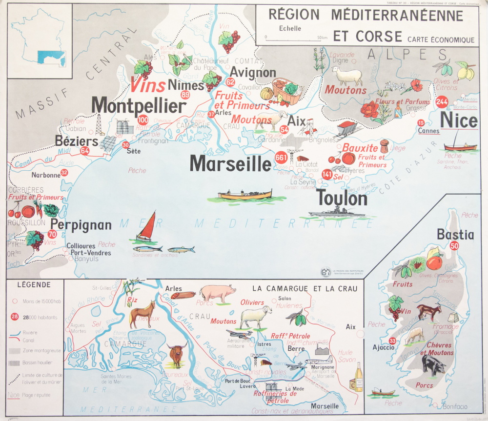 Au verso, carte de la région méditerranéenne et de la Corse où figurent les différentes productions agricoles, industrielles et énergétiques ainsi que les principales villes, les canaux et les principaux cours d'eau.
