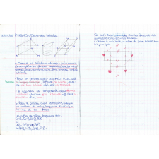 Description : Cahier agrafé, couverture cartonnée bicolore, 1ère de couverture avec la moitié supérieure rouge motif façon tissu, et inscription blanche "Sergio Tacchini"et logo blanc. Moitié inférieure grise imprimée façon tissu, 2 bandes blanches surpiquées séparent les deux moitiés. 4ème de couverture identique. la couverture est recouverte recto-verso par 2 feuilles de dessin perforées en partie collées sur lesquelles des opérations et "Mathématiques" sont manuscrits .Réglure seyès, encre bleue, rouge, noire et verte, crayon de bois, feutres de couleur. 2 feuilles collées ensemble, 2 copies doubles grand format perforées avec 2 polycopiés collés insérées, 3 feuilles réglure seyès collées sur des pages.