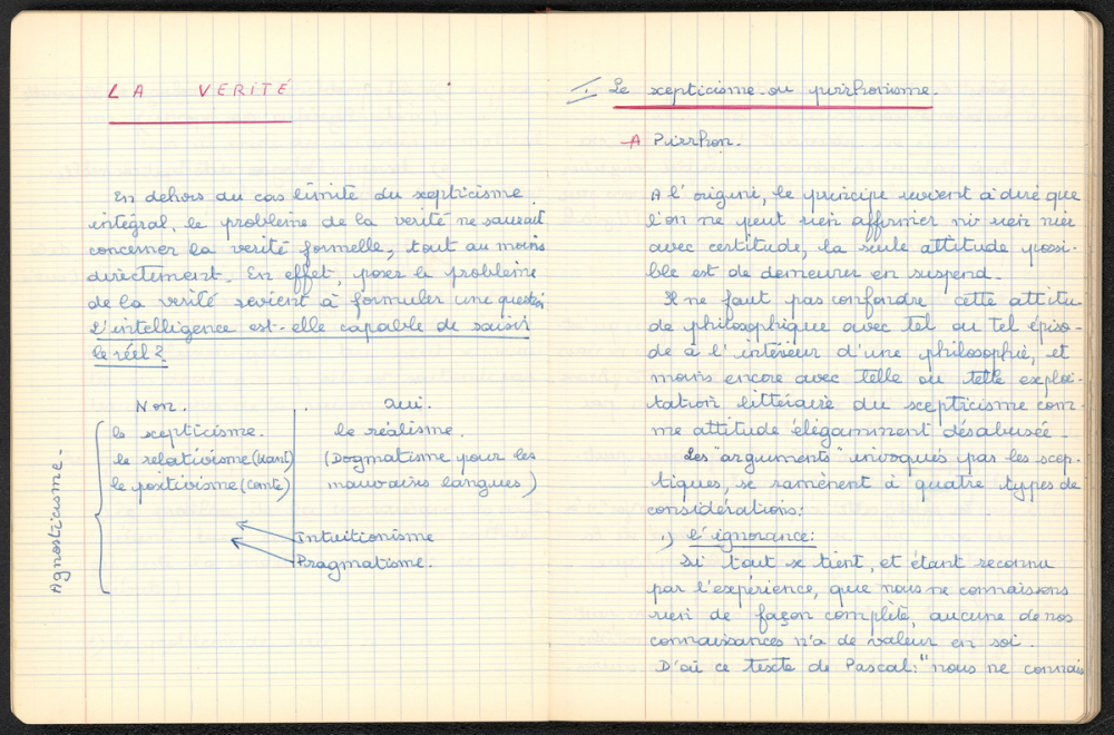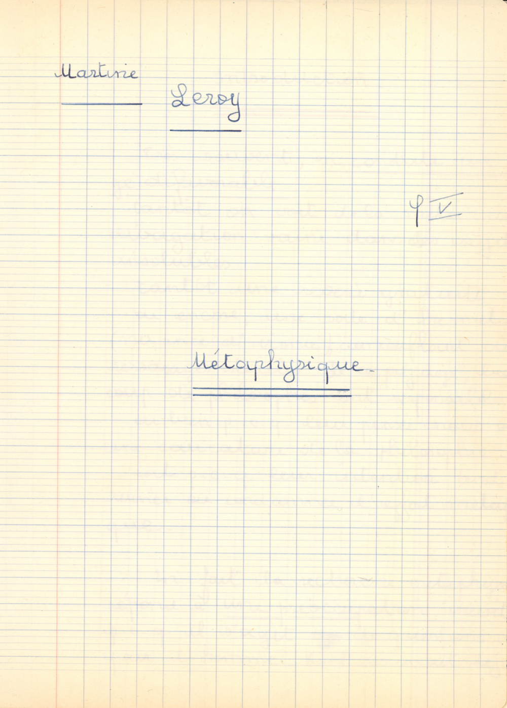 Notes : Cahier de Métaphysique de Martine Leroy-Bouveyron (née Leroy) alors âgée de 18 ans, élève de terminale Philo V, au Lycée Victor Duruy à Paris (VIIe arrondissement), durant l'année de son baccalauréat en 1965-1966.