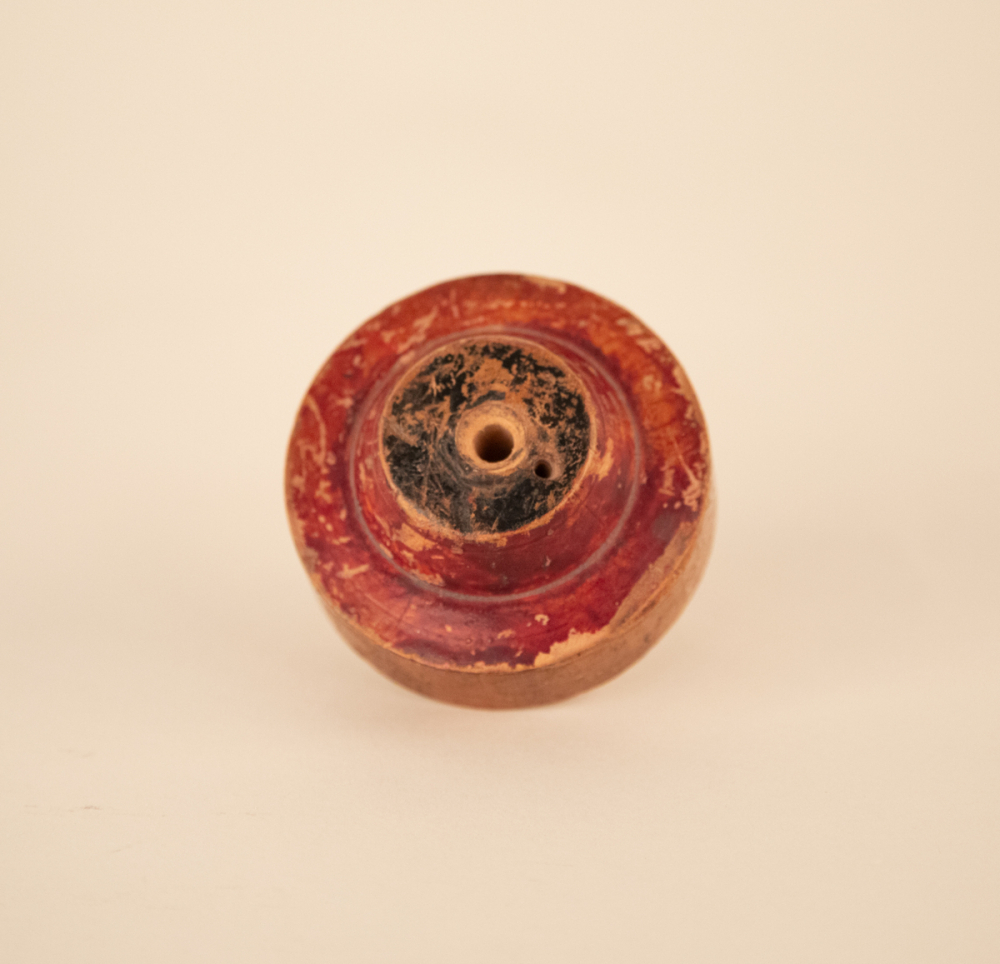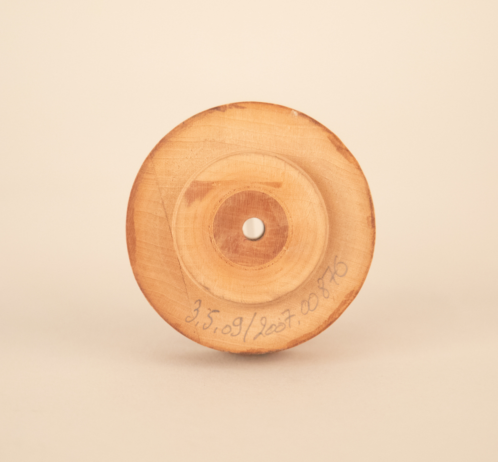 Description : Pièce de bois monobloc, vernis, peinture, traits de crayons.