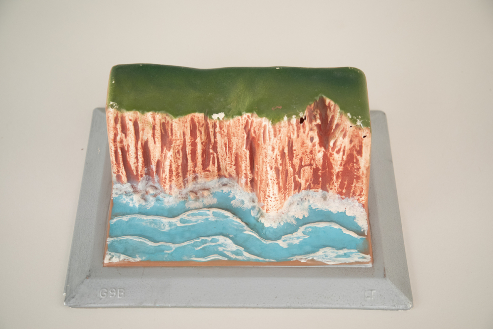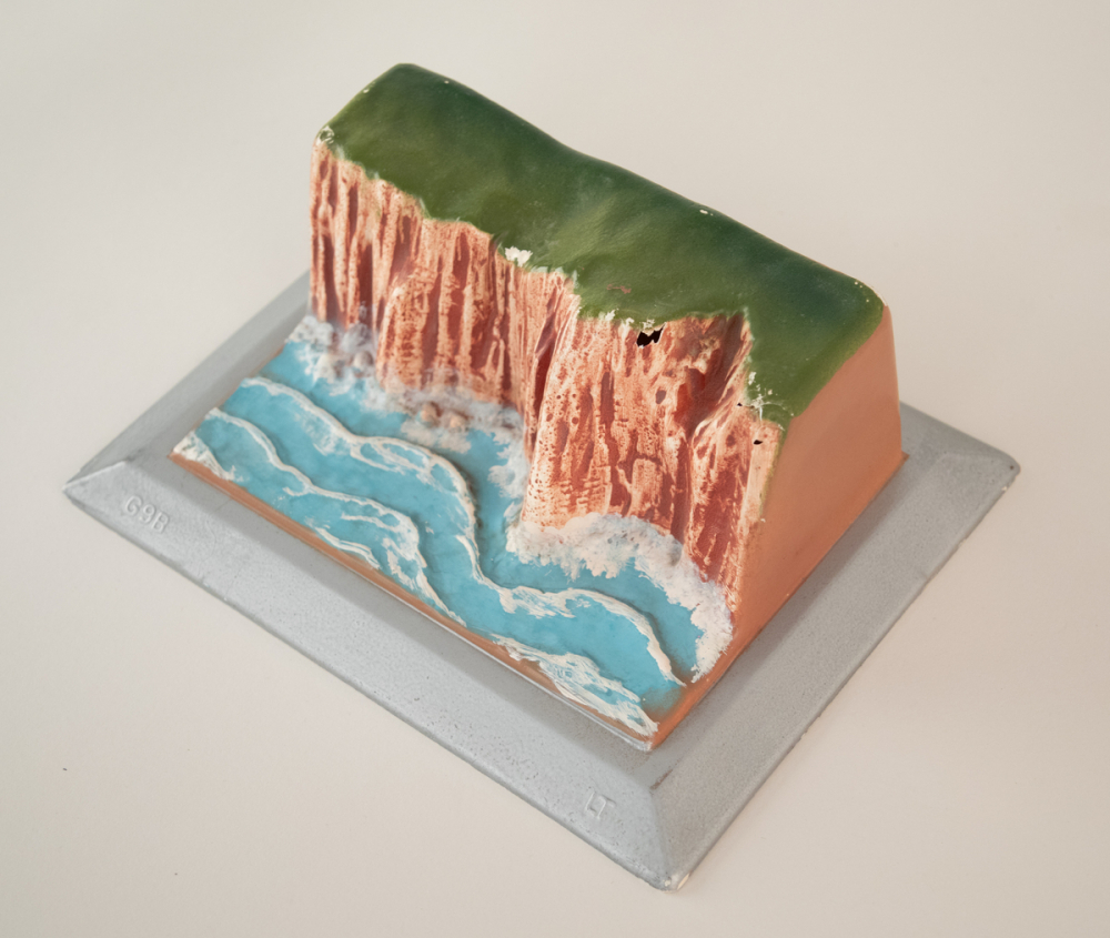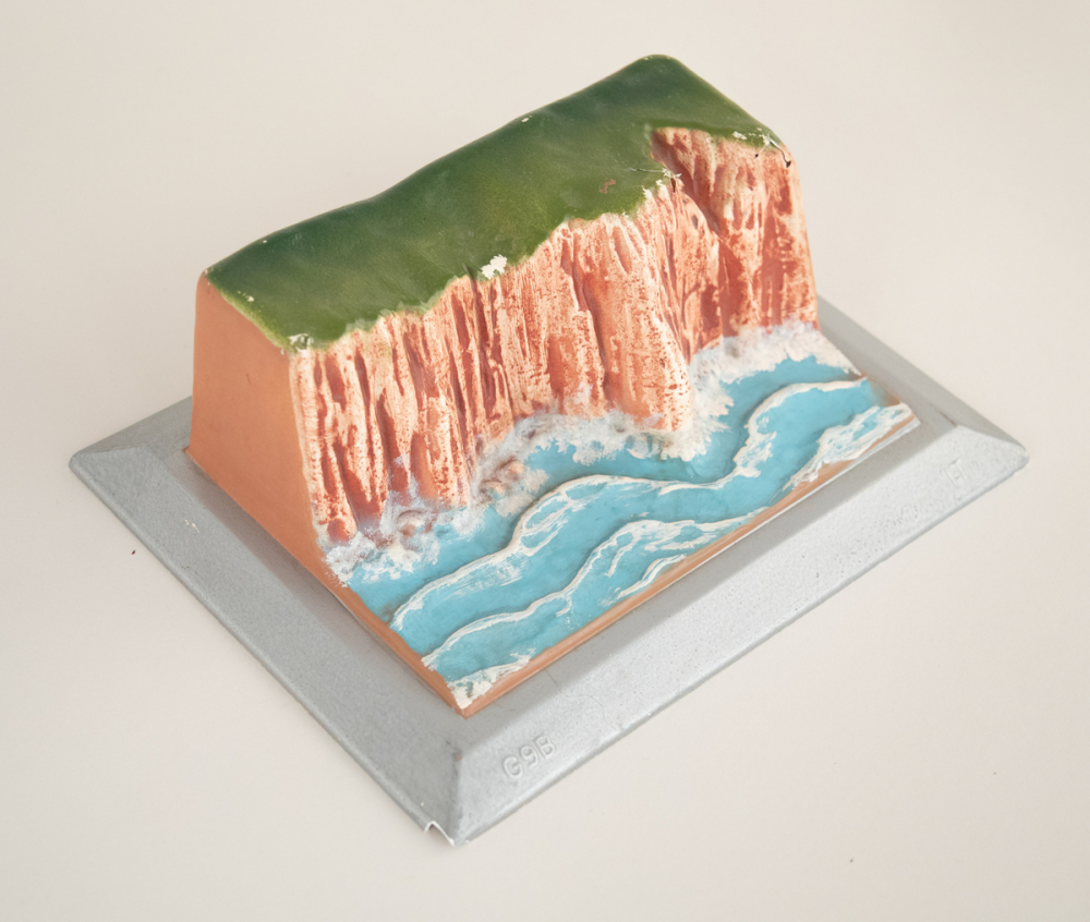 Représentations : bord de mer, falaise / Modèle en relief (ou bloc-diagramme) peint, représentant une côte à falaise calcaire, surmontée d'un plateau en herbe ; au premier plan, la mer dont les vagues viennent jusqu'au pied de la falaise.
