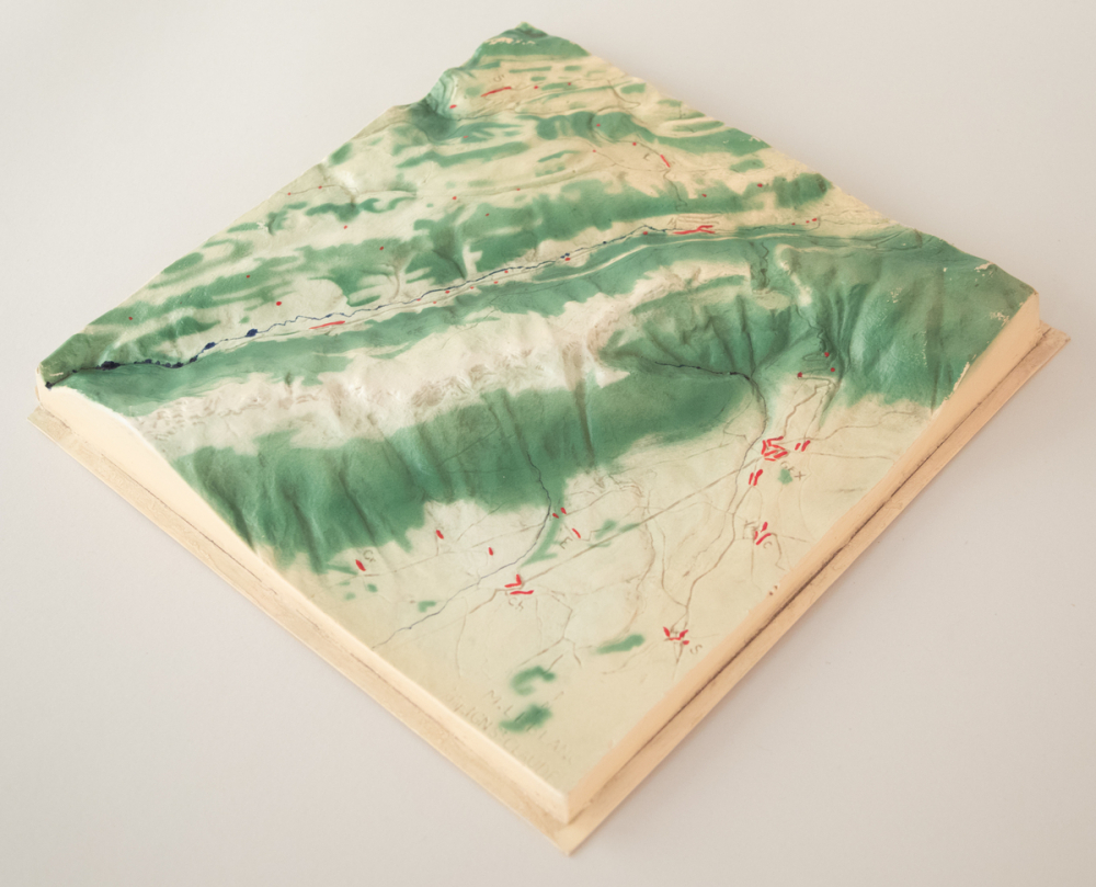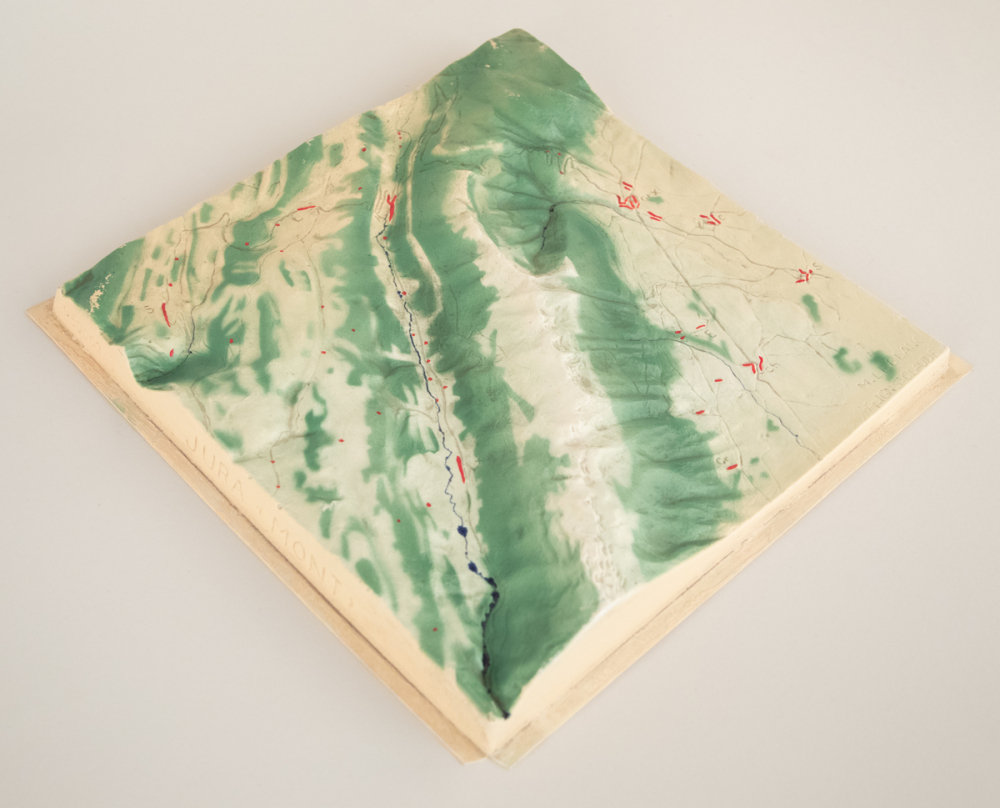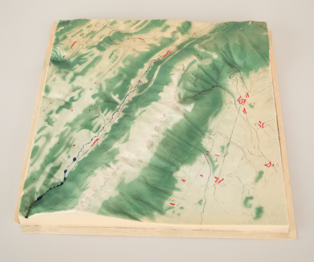 Représentations : montagne, Jura, Gex / Modèle en relief (ou bloc-diagramme) peint, représentant les environs de Gex (Ain) et notamment le Florimont, sommet du massif du Jura ; les couleurs correspondent au couvert (végétation, constructions) et plusieurs communes villes sont nommées (Gex) ou indiquées par leur initiale.
