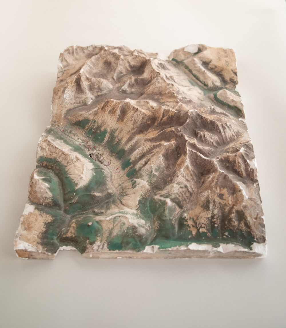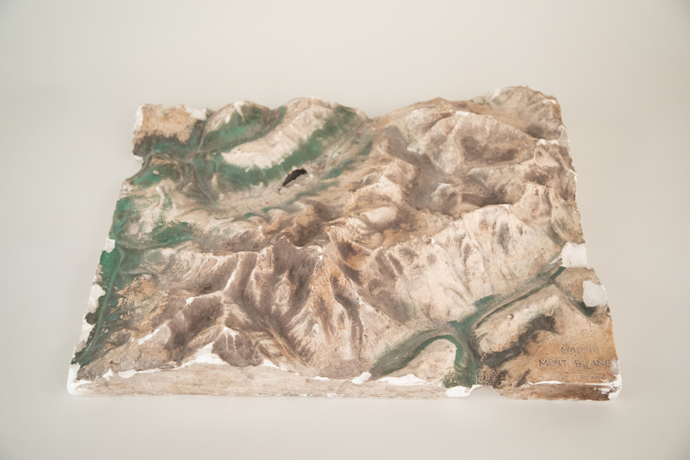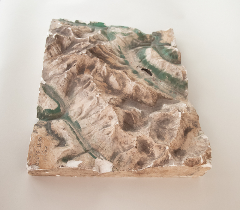 Représentations : Mont Blanc / Modèle en relief (ou bloc-diagramme) en plâtre peint représentant le massif du Mont Blanc. Le titre, le nom de l'auteur et l'échelle sont gravés en bas à droite.