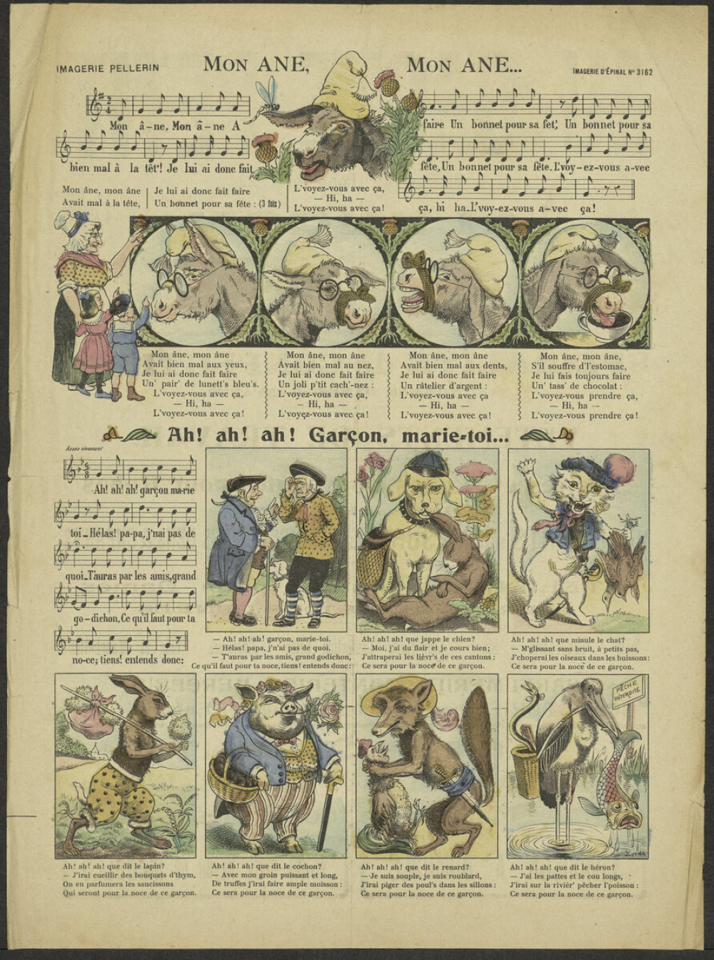 Notes : Illustration de deux chansons, "Mon âne, mon âne..." et "Ah ! ah ! ah ! Garçon, marie-toi...", avec partition et texte de chaque chanson.