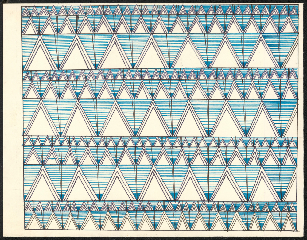 Description : Motifs géométriques répétés coloriés au feutre bleu, noir, ou gris.