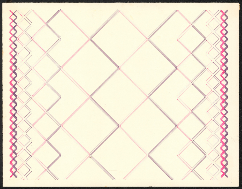 Représentations : figure géométrique / Dessin de carrés de diverses tailles, délimités pour la plupart par trois lignes serrées de feutre rose ou violet, d'autres n'ayant que deux lignes ou bien un trait épais.