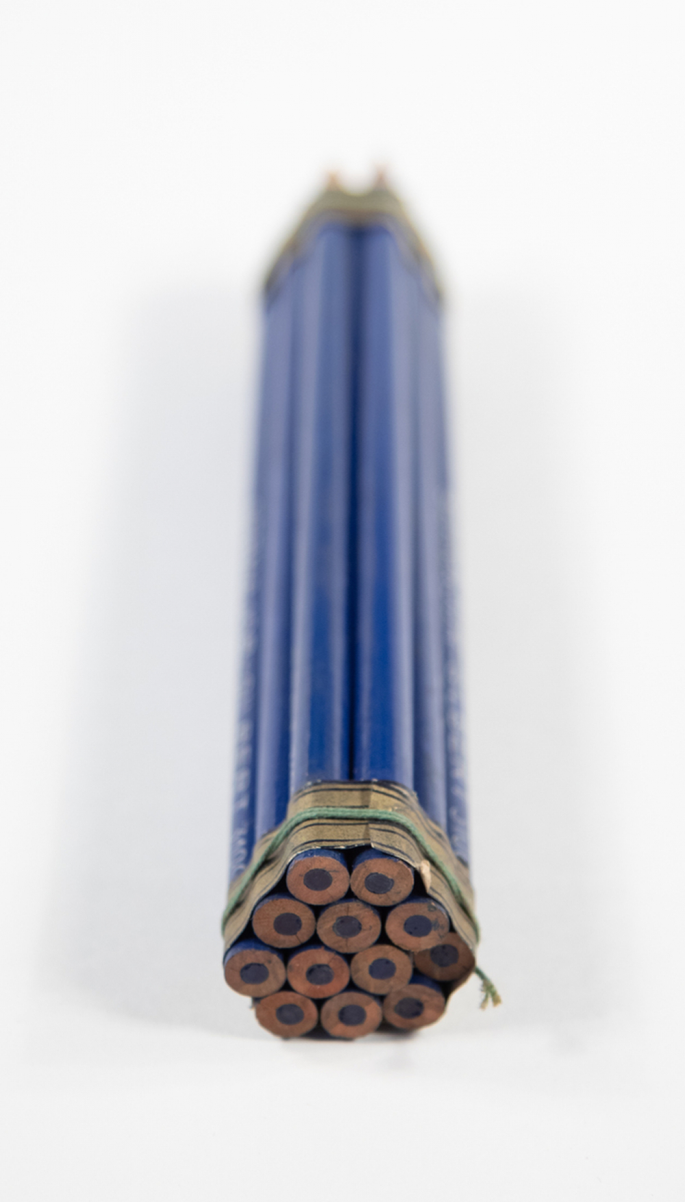 Description : Ensemble de 12 crayons à corps rond, en bois, identiques, taillés, groupés entre-eux par une bande de papier aux deux extrémités.