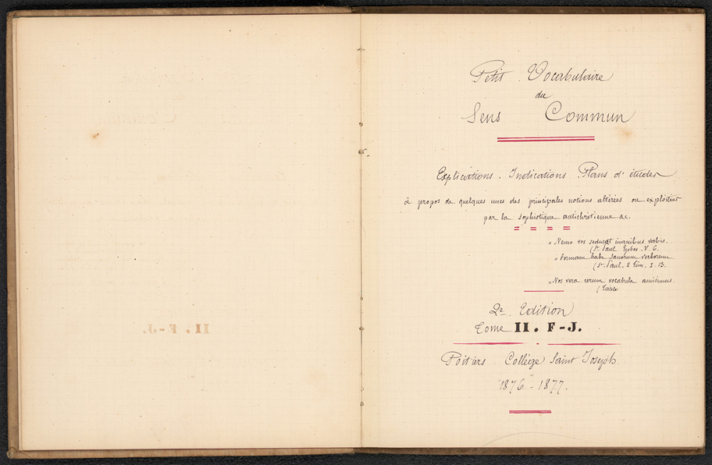 Notes : Il s'agit du deuxième volume, d'une série de quatre, d'un dictionnaire notionnel, du Révérend Père Georges Longhaye, adressé à Henry Taudière, élève de terminale scolarisé au collège Saint-Joseph de Poitiers, durant l'année 1876 à 1877 ; établissement où l'auteur professe la grammaire, la rhétorique, les humanités, ainsi que son Cours supérieur de littérature et son Cours public d'apologétique.
