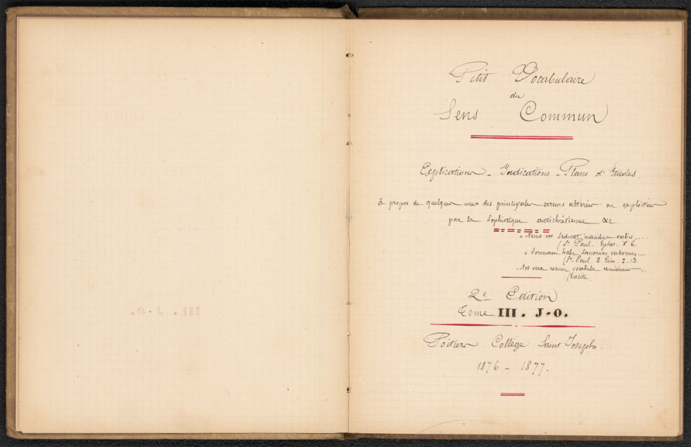 Notes : Il s'agit du troisième volume, d'une série de quatre, d'un dictionnaire notionnel, du Révérend Père Georges Longhaye, adressé à Henry Taudière, élève de terminale scolarisé au collège Saint-Joseph de Poitiers, durant l'année 1876 à 1877 ; établissement où l'auteur professe la grammaire, la rhétorique, les humanités, ainsi que son Cours supérieur de littérature et son Cours public d'apologétique.