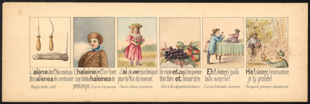 Planche illustrée pour apprendre l'homonymie : alène / haleine, ai / et / eh/ hé