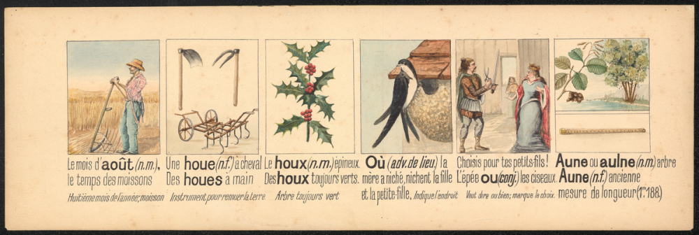 Planche illustrée pour apprendre l'homonymie : août / houe / houx / où / ou, aune / aulne