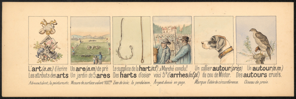 Description : Planche sur papier produit par l'ancienne manufacture Canson & Montgolfier Vidalon-les-Annonay, de qualité B soit une épaisseur adaptée au crayon, aux études ou aux croquis. Format paysage, comprenant 6 vignettes dessinées et colorées à la main. Sous chacune se trouvent trois lignes de texte présentant les exemples d'homonymie.