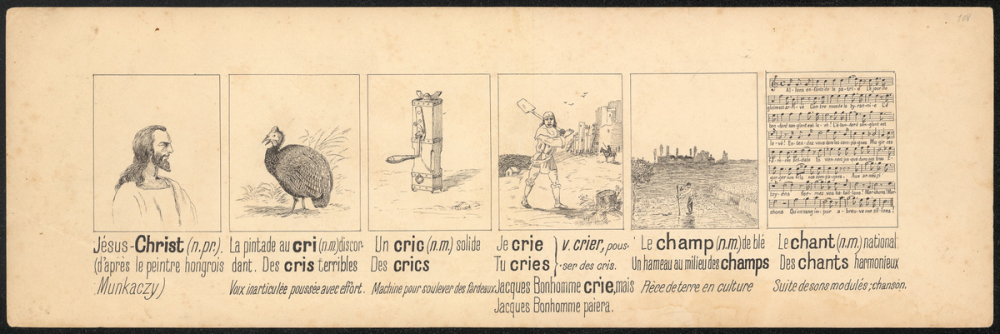 Représentations : pintade, champ, chant / Les vignettes illustrent dans l'ordre suivant : Jésus-Christ ; la pintade au cri discordant ; un cric solide ; je crie ; le champ de blé ; le chant national.