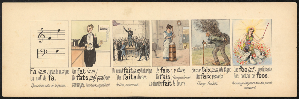 Représentations : fée / Les vignettes illustrent dans l'ordre suivant : Fa, note de musique ; un fat ; un grand fait historique ; je fais ; sous le faix du fagot ; une fée bienfaisante.