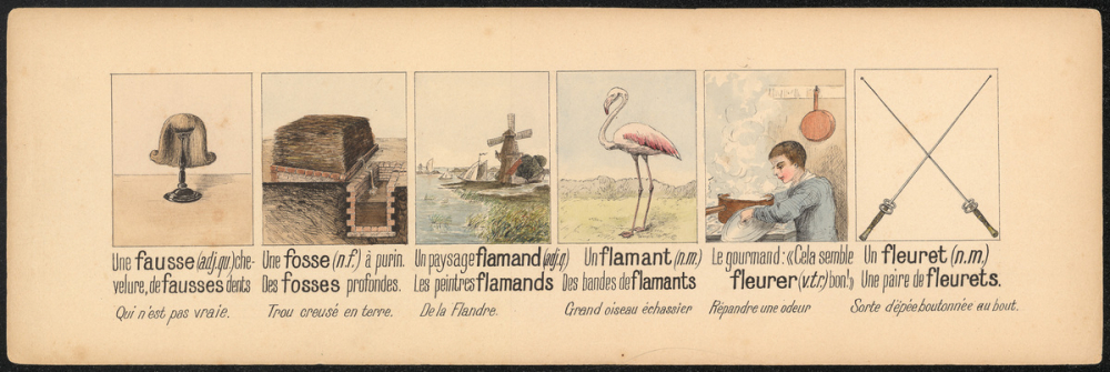 Représentations : perruque, fosse, flamant rose, épée / Les vignettes illustrent dans l'ordre suivant : une fausse chevelure ; une fosse à purin ; un paysage flamand ; un flamant ; cela semble fleurer bon ; un fleuret.