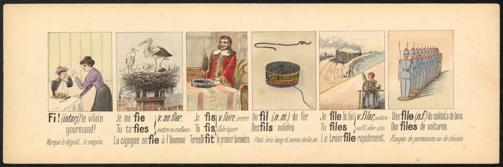 Planche illustrée pour apprendre l'homonymie : fi / fie / fis , fil / file