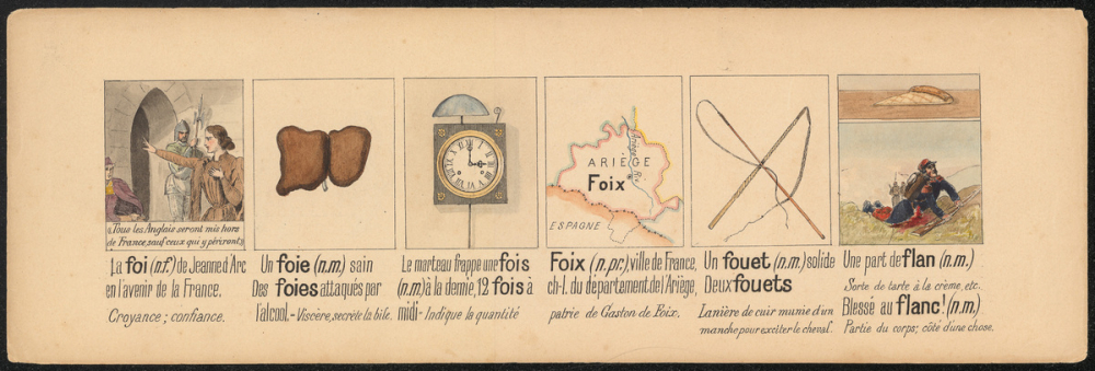 Planche illustrée pour apprendre l'homonymie : foi / foie / fois / Foix, fouet, flan / flanc