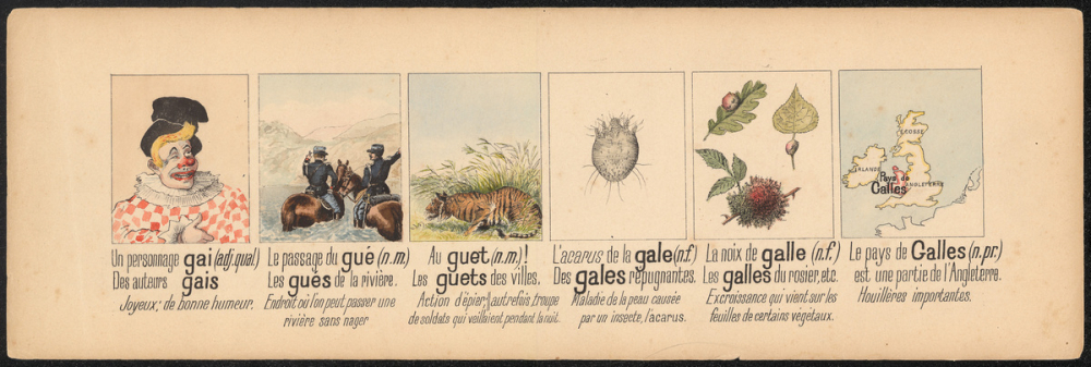 Représentations : clown, gué, tigre, Pays de Galles / Les vignettes illustrent dans l'ordre suivant : un personnage gai ; le passage du gué ; au guet ! ; l'acarus de la gale ; la noix de galle ; le pays de Galles.