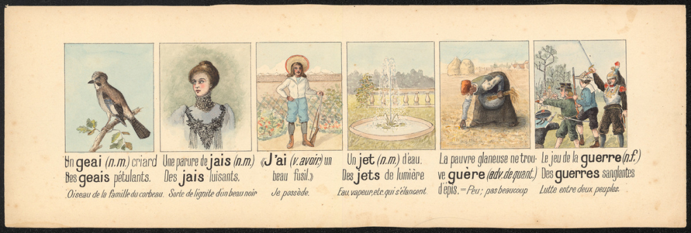 Représentations : geai, parure, fusil, jet d'eau, la guerre / Les vignettes illustrent dans l'ordre suivant : un geai criard ; une parure de jais ; j'ai un beau fusil ; un jet d'eau ; la pauvre glaneuse ne trouve guère d'épis ; le jeu de la guerre.