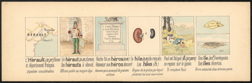 Planche illustrée pour apprendre l'homonymie : Hérault / héraut / héros, hile / il / île