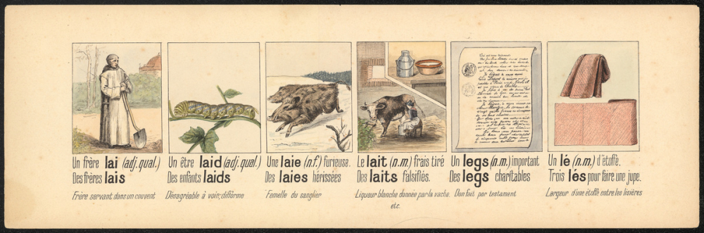 Planche illustrée pour apprendre l'homonymie : lai / lai / laie / lait / legs / lé