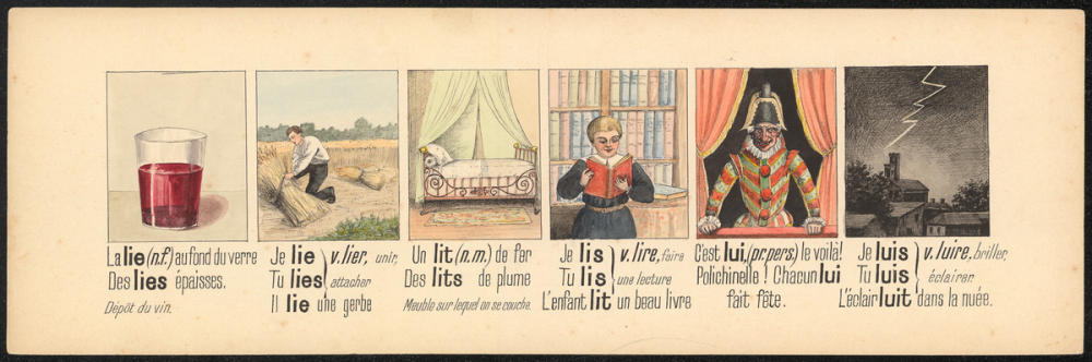 Représentations : vin, gerbe, lit, lecture, Polichinelle, orage / Les vignettes illustrent dans l'ordre suivant : la lie au fond du verre ; je lie ; un lit de fer ; je lis ; c'est lui ; je luis.